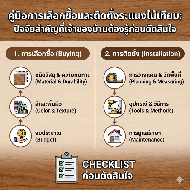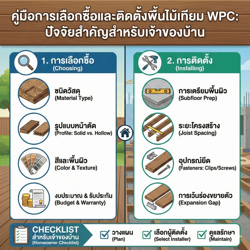 เมื่อเจ้าของบ้านทราบถึงข้อดีที่เหนือกว่าของ พื้นไม้เทียม WPC (Wood Plastic Composite) แล้ว ขั้นตอนถัดไปคือการเลือกผลิตภัณฑ์ที่เหมาะสมที่สุดและการวางแผนการติดตั้งอย่างถูกต้อง เนื่องจากคุณภาพและเทคนิคการติดตั้งที่แตกต่างกันจะส่งผลโดยตรงต่ออายุการใช้งานและความสวยงามของพื้น บทความนี้จะให้ข้อมูลเชิงลึกเกี่ยวกับปัจจัยสำคัญที่ผู้บริโภคควรพิจารณาก่อนตัดสินใจซื้อและติดตั้งพื้นไม้เทียม